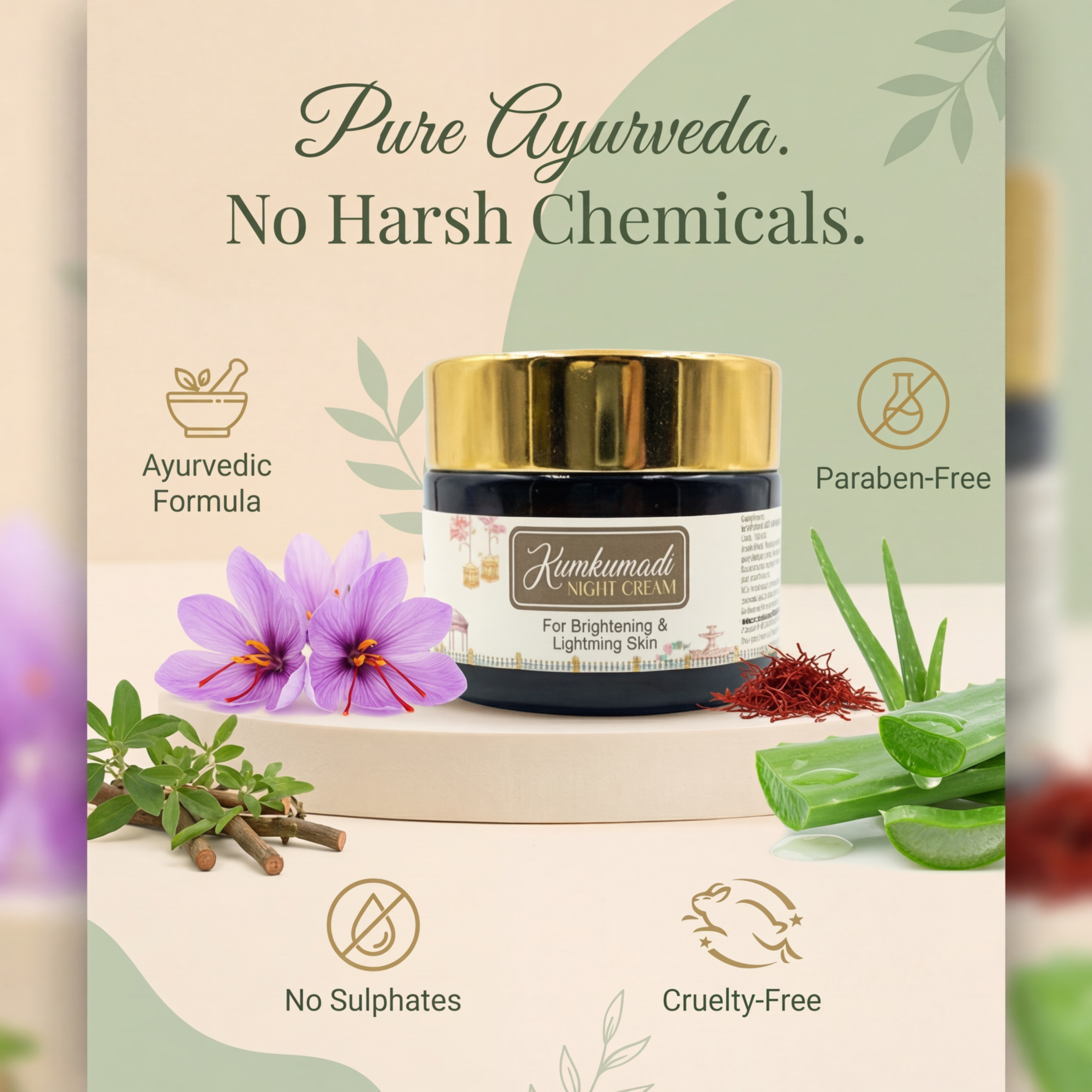 Unlike many chemical-based skincare products, Krivedha Kumkumadi Night Cream is formulated with no harsh chemicals, no sulphates, and no parabens, ensuring safe and effective care for your skin.